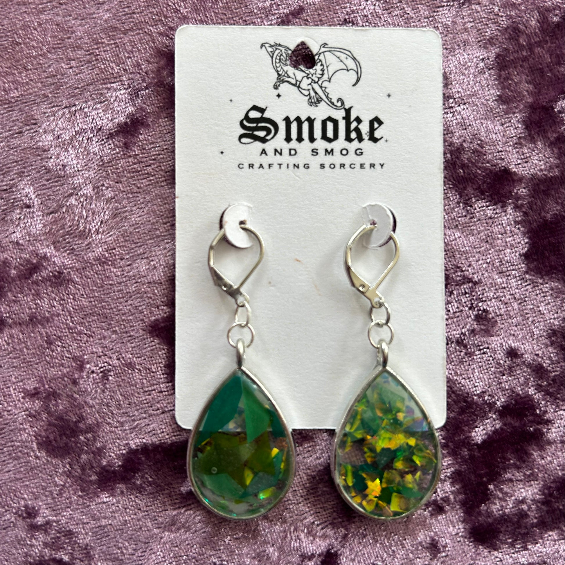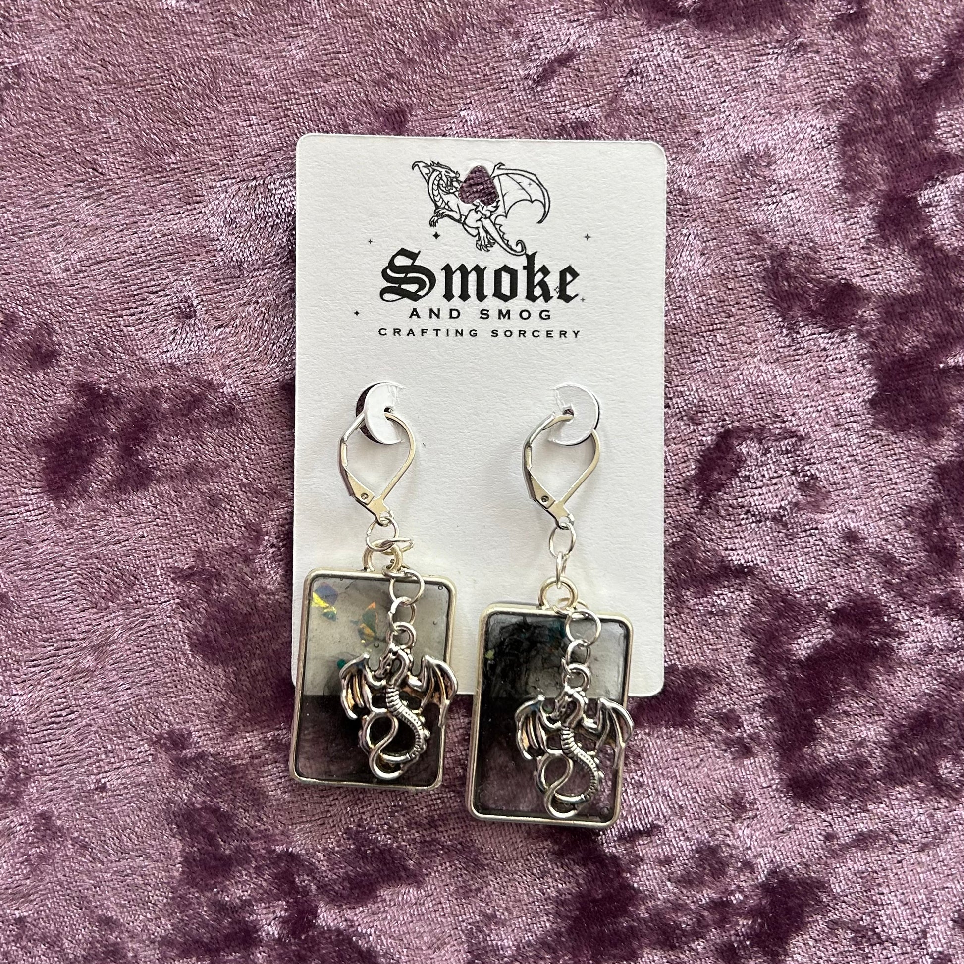 Dangling earrings made with resin, some include glitter, UV gel, dried flowers, and/or charms