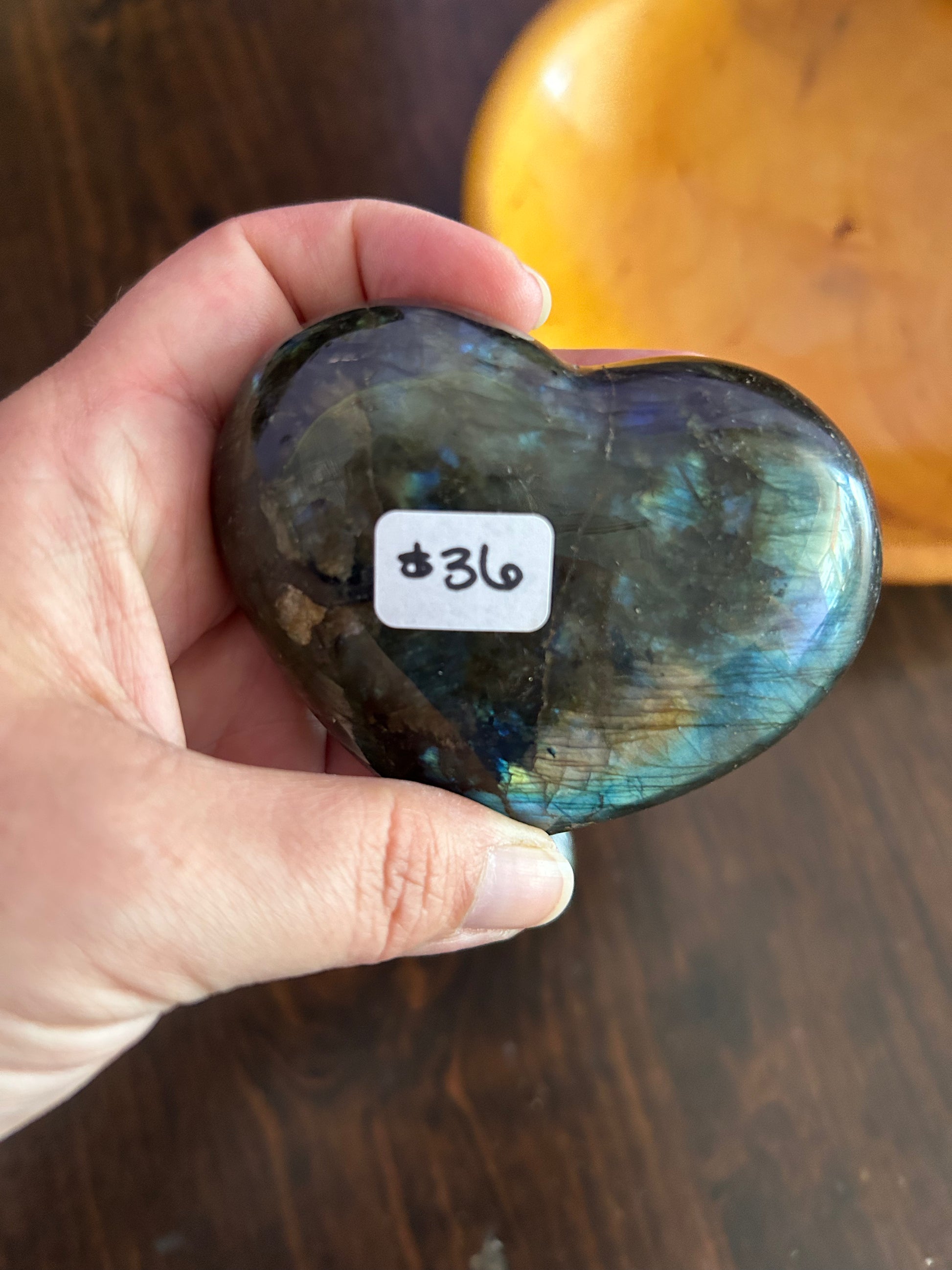 Large carved and polished labradorite heart with brilliant flash