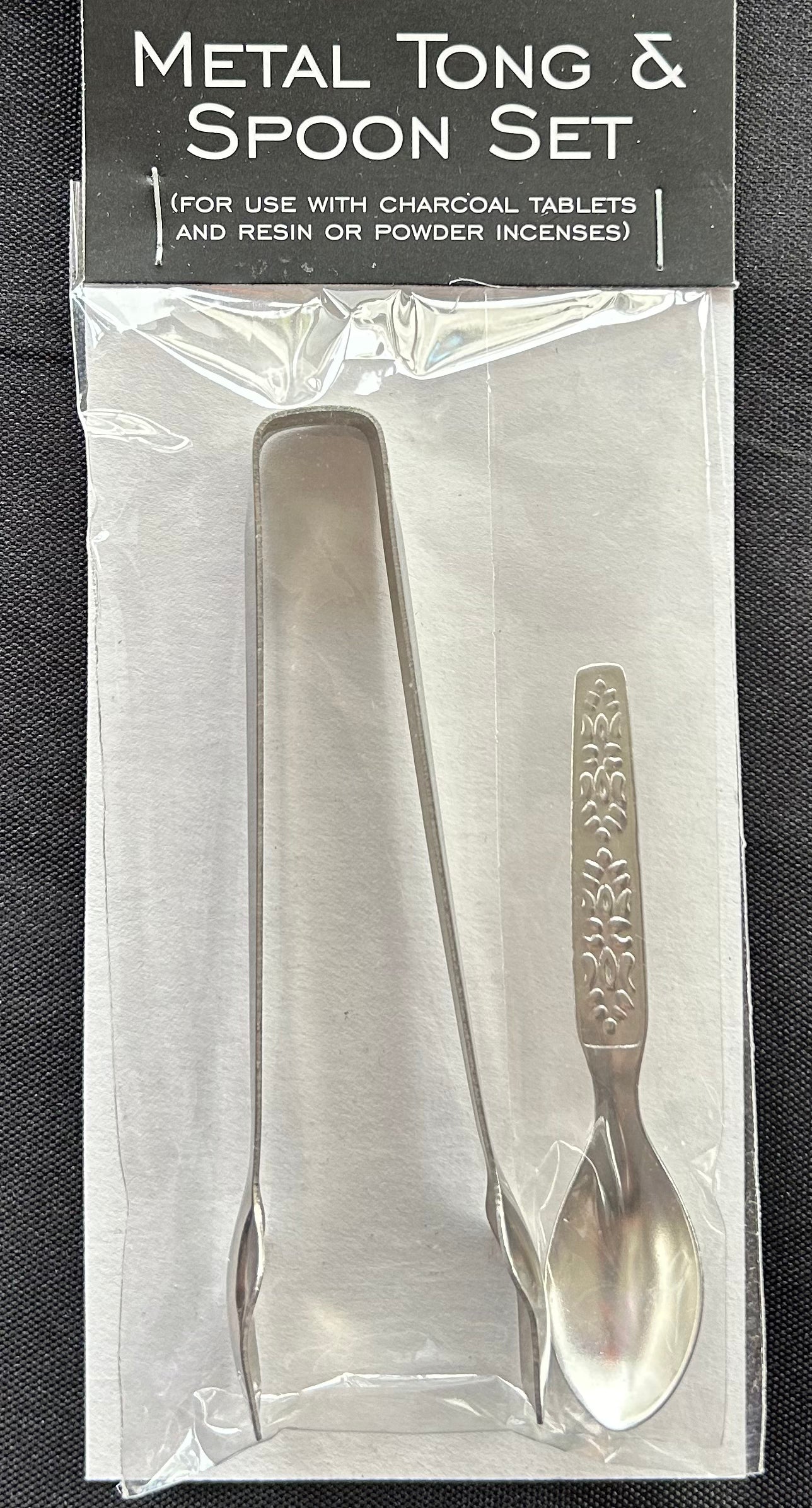 Metal tong and spoon set for use with charcoal briquettes and powder or resin incense